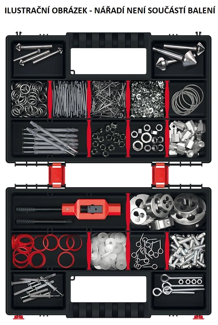 Wnętrze dopasujesz za pomocą wyjmowanych przegród – stworzysz małe, średnie i większe komory dokładnie według bieżących potrzeb. Solidna konstrukcja i niezawodne zamki chronią przechowywane elementy przed rozsypaniem i uszkodzeniem, zarówno w warsztacie, jak i w transporcie.