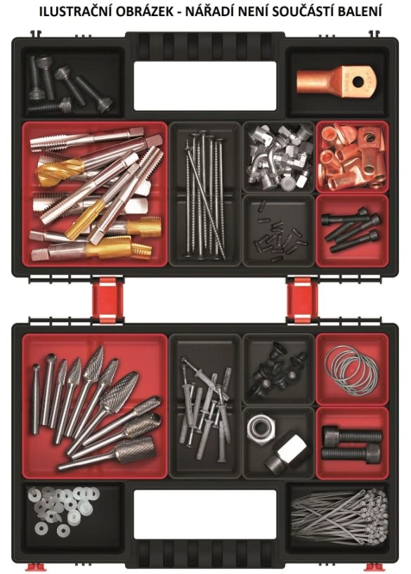Każdy organizer zawiera 6 wyjmowanych przegródek, które możesz ułożyć zgodnie z bieżącymi potrzebami. Solidne zatrzaski i ergonomiczny uchwyt zapewniają pewny chwyt i bezpieczny transport, a wytrzymały korpus z mieszanki polimerowej wytrzymuje codzienne użytkowanie w warsztacie i na budowie.