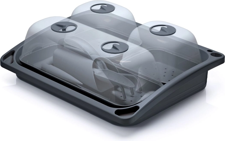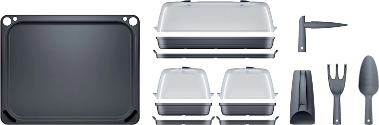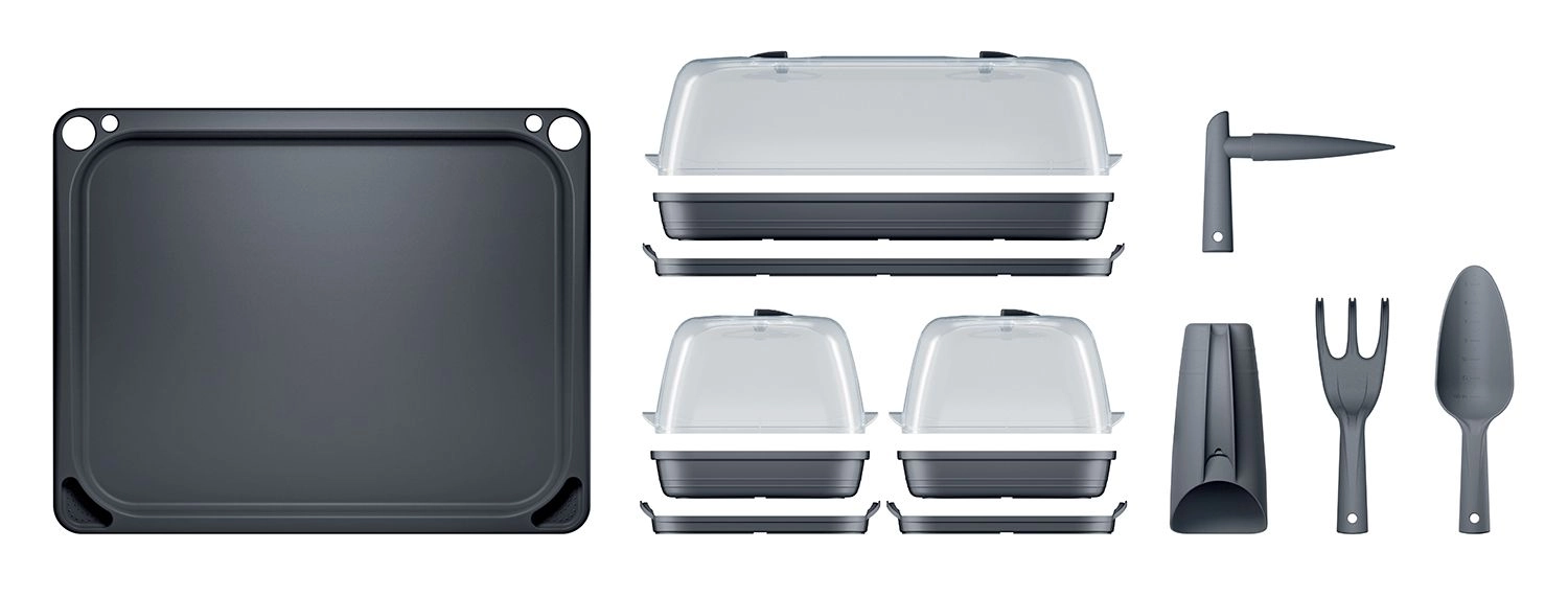 W zestawie znajdziesz trzy miniszklarenki, tackę oraz cztery sztuki narzędzi (pikownik, łopatka, grabki, miska na podłoże) – wszystko w dopasowanym antracytowym kolorze. Zestaw idealny do kiełkowania nasion, rozmnażania z sadzonek oraz uprawy drobnych ziół na parapecie czy kuchennym blacie.