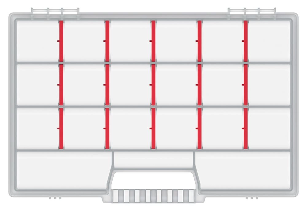 Elastyczne rozmieszczenie umożliwiają wyjmowane przegrody, więc z łatwością ustawisz rozmiar przegródek zgodnie z aktualnymi potrzebami. Solidny uchwyt zapewnia wygodne i bezpieczne przenoszenie podczas pracy w domu, w garażu i w drodze.