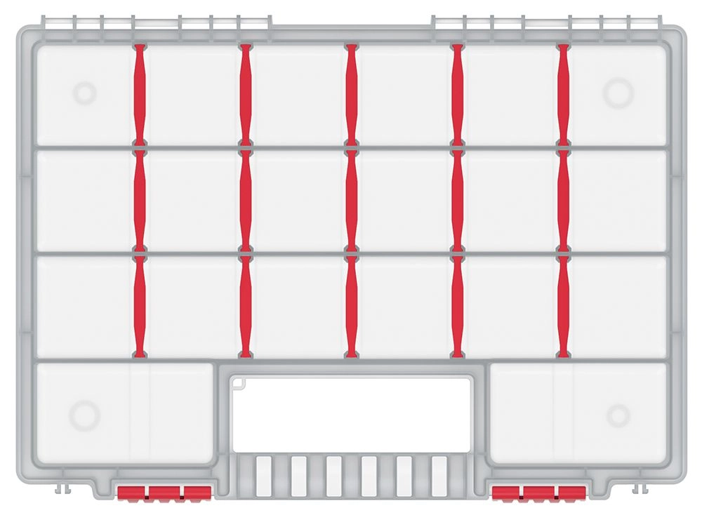 Utrzymaj porządek w drobnych elementach złącznych z organizerem NORT. Dzięki 22 przegródkom i wyjmowanym przegrodom łatwo stworzysz taki układ, który dokładnie odpowie Twoim potrzebom. Przezroczysta pokrywa umożliwia natychmiastową kontrolę zawartości, więc zawsze szybko znajdziesz to, czego szukasz.