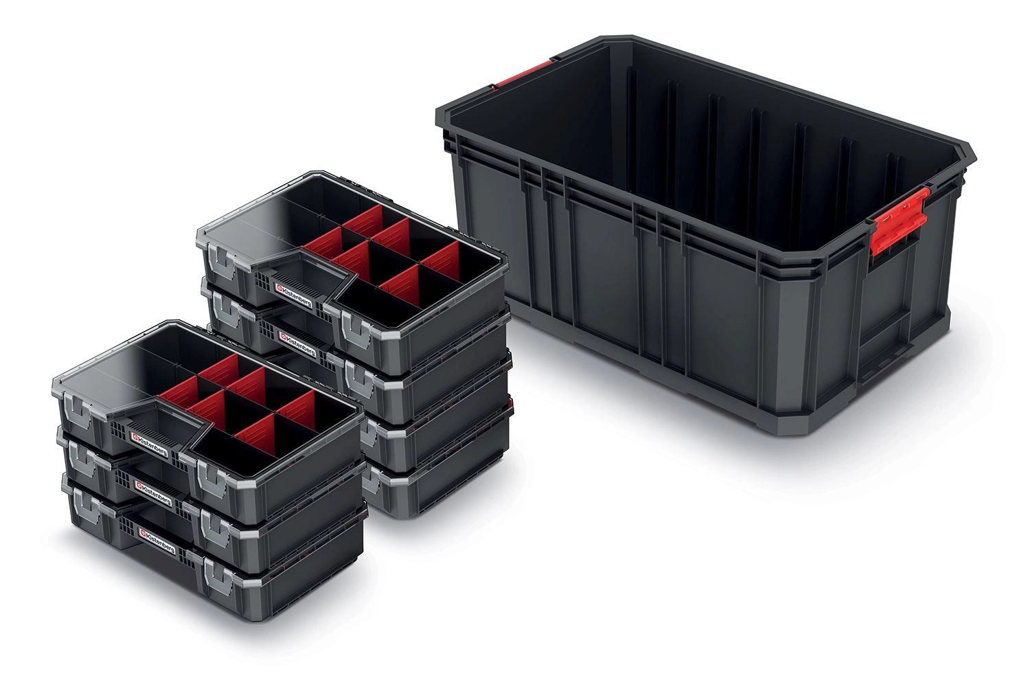 W zestawie znajdują się oddzielne organizery z przezroczystymi pokrywami i wyjmowanymi przegrodami, dzięki czemu dostosujesz układ wewnętrzny do swoich potrzeb. Box jest kompatybilny z elementami systemu MODULAR SOLUTION, co umożliwia modułowe rozszerzanie, łączenie i sztaplowanie dla maksymalnej oszczędności miejsca.