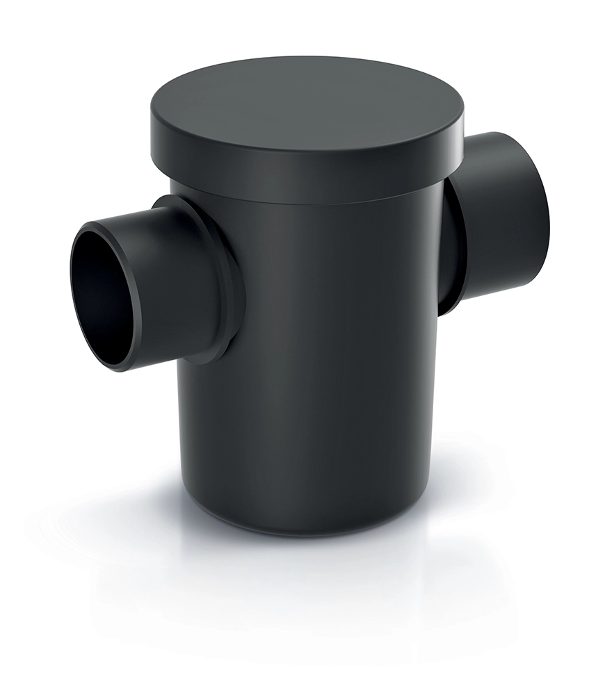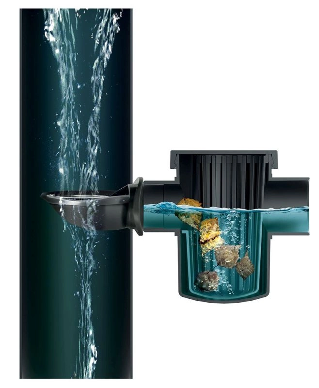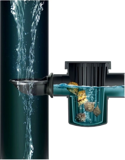 Wewnętrzny kosz zatrzymuje liście, piasek i inne stałe cząstki jeszcze przed wejściem do zbiornika, chroniąc instalacje i pompy przed zatkaniem.