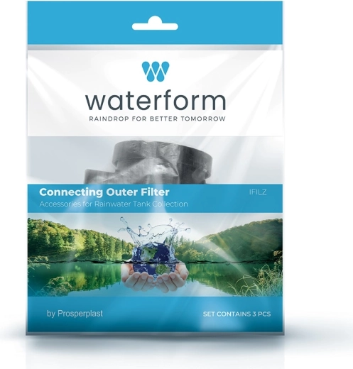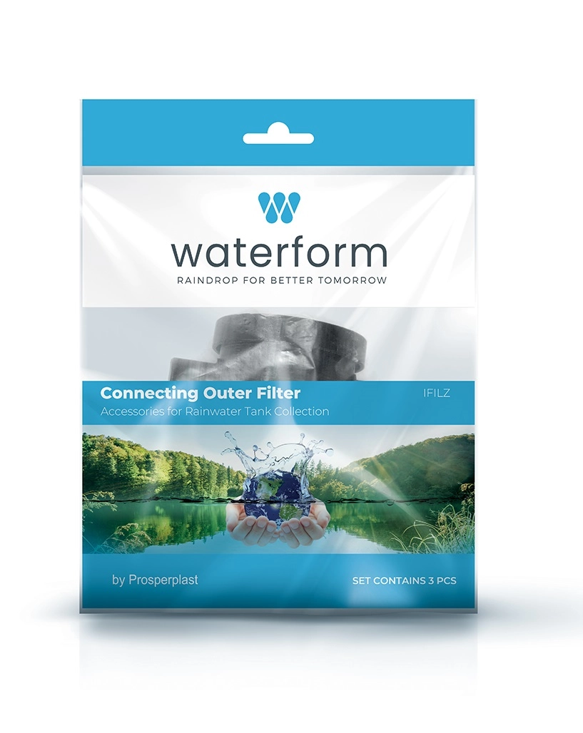 Trzyczęściowy zestaw w opakowaniu detalicznym jest przygotowany do szybkiego włączenia w system zbierania deszczówki w beczkach WATERFORM i ARVES.