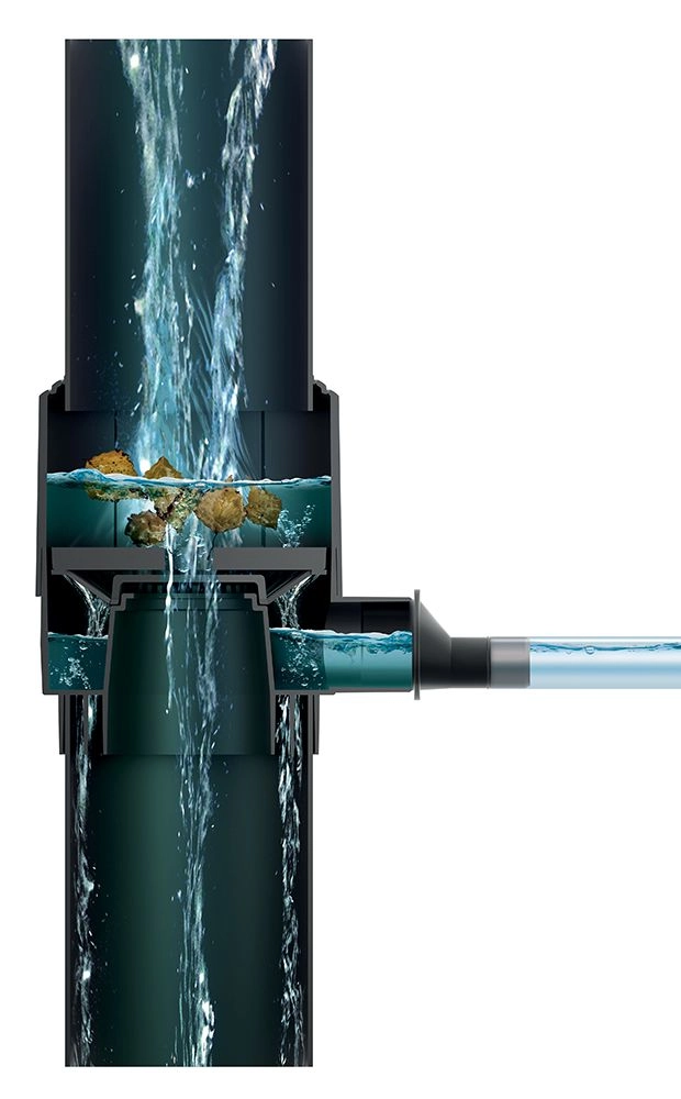 Wewnętrzne prowadzenie strumienia kieruje wodę i zatrzymuje liście oraz grubsze cząstki, co zmniejsza ryzyko zapychania i poprawia jakość wody deszczowej.