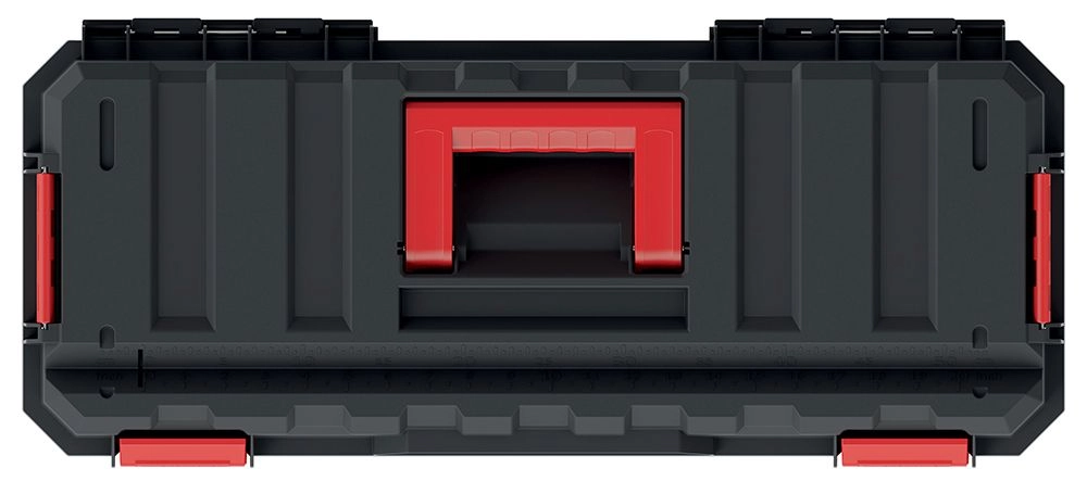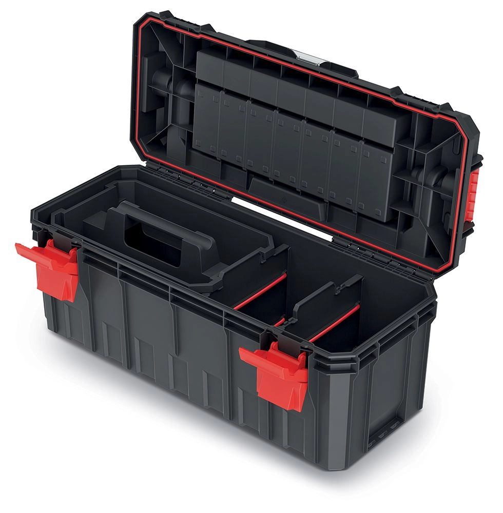 Wewnętrzny układ z wyjmowanym nosidłem ułatwia dostęp do często używanych elementów i pomaga utrzymać porządek. Mocne klamry ABS trzymają pokrywę pewnie zamkniętą, a skrzynia jest w pełni kompatybilna z modułowym systemem X BLOCK, co umożliwia łatwe sztaplowanie i transport.