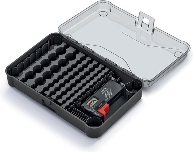 Praktyczny pojemnik na baterie z przezroczystą pokrywą oferuje jasny przegląd ogniw AA, AAA, C, D i 9V, które umieścisz w dedykowanych przegródkach. Zintegrowany analogowy tester pozwala w kilka chwil sprawdzić pozostałą pojemność, dzięki czemu zawsze wiesz, które baterie są gotowe do użycia.