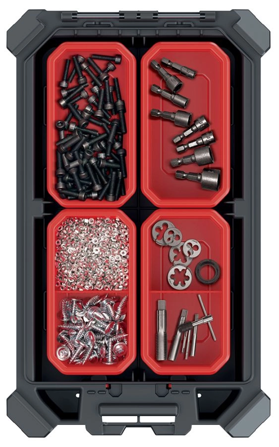 W zestawie znajduje się modułowy system zatrzasków, dzięki któremu organizer można łatwo połączyć z innymi elementami serii MSX. Uszczelnienie przeciw kurzowi i wilgoci utrzymuje śrubki, bity, kołki czy drobne narzędzia w suchości i czystości – idealne rozwiązanie dla serwisantów, rzemieślników i użytkowników hobbystycznych.