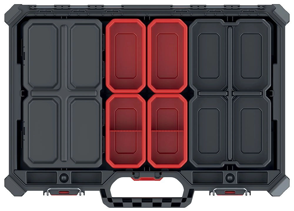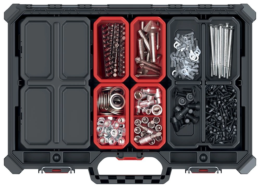 Dzięki 7 wyjmowanym pojemnikom i 3 przegrodom łatwo dopasujesz wnętrze do bieżących potrzeb. Metalowe zawiasy i klamry z ABS z elementami metalowymi utrzymują pokrywę pewnie zamkniętą, a uszczelnienie przeciwpyłowe i wodoodporne chroni zawartość podczas transportu oraz pracy w zapylonym lub wilgotnym środowisku. Organizer można łączyć w systemie X BLOCK dzięki mechanizmowi zatrzaskowemu, co ułatwia sztaplowanie i przenoszenie.