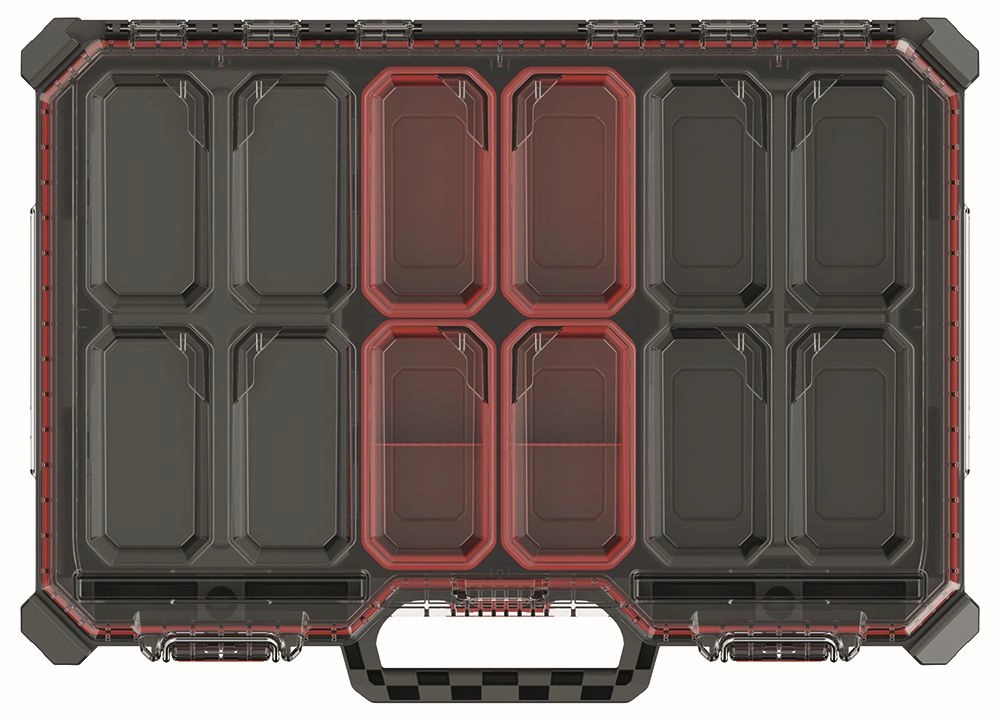 Utrzymaj porządek w warsztacie, garażu i podczas montaży w terenie. Ten niski organizer o kompaktowych wymiarach 54,3 × 39 × 7,7 cm oferuje przemyślany podział dla śrub, wkrętów, kołków i drobnych narzędzi. Przezroczysta pokrywa z poliwęglanu umożliwia szybki wgląd bez otwierania, a wytrzymały korpus z tworzywa jest odporny na uderzenia i codzienne użytkowanie.