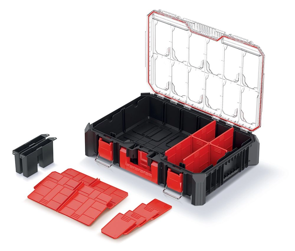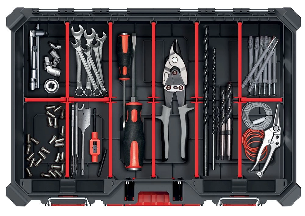 Wnętrze łatwo dopasujesz do swoich potrzeb: do dyspozycji są 2 wyjmowane boxy oraz 7 przegród do elastycznego podziału. Za pomocą systemu blokady MSX można połączyć organizer z innymi produktami serii X BLOCK, tworząc modułowy system przechowywania dokładnie według Twoich potrzeb. Ergonomiczny uchwyt zapewnia wygodne i bezpieczne przenoszenie nawet przy pełnym obciążeniu.