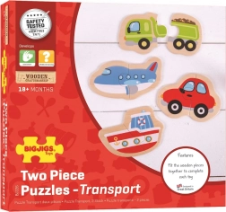 Ten zestaw drewnianych puzzli zawiera cztery ulubione pojazdy, które dzieci łatwo ułożą z dwóch solidnych elementów. Proste kształty, wyraziste kolory i przyjemne drewniane wykonanie zachęcają do wielokrotnej zabawy oraz naturalnie wspierają rozwój mowy, rozpoznawanie kształtów i kolorów oraz koncentrację.