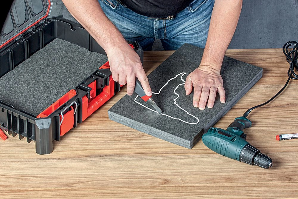 Wystarczy odrysować zarys narzędzia i wyciąć – szybka regulacja rozmiaru i głębokości dla idealnego osadzenia.