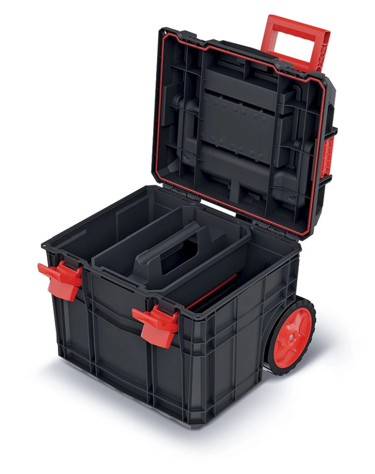 Zintegrowane kółka i wytrzymały uchwyt umożliwiają wygodne przewożenie nawet cięższych narzędzi w warsztacie i na budowie. Skrzynia jest stabilna, dobrze się prowadzi i odciąża plecy.