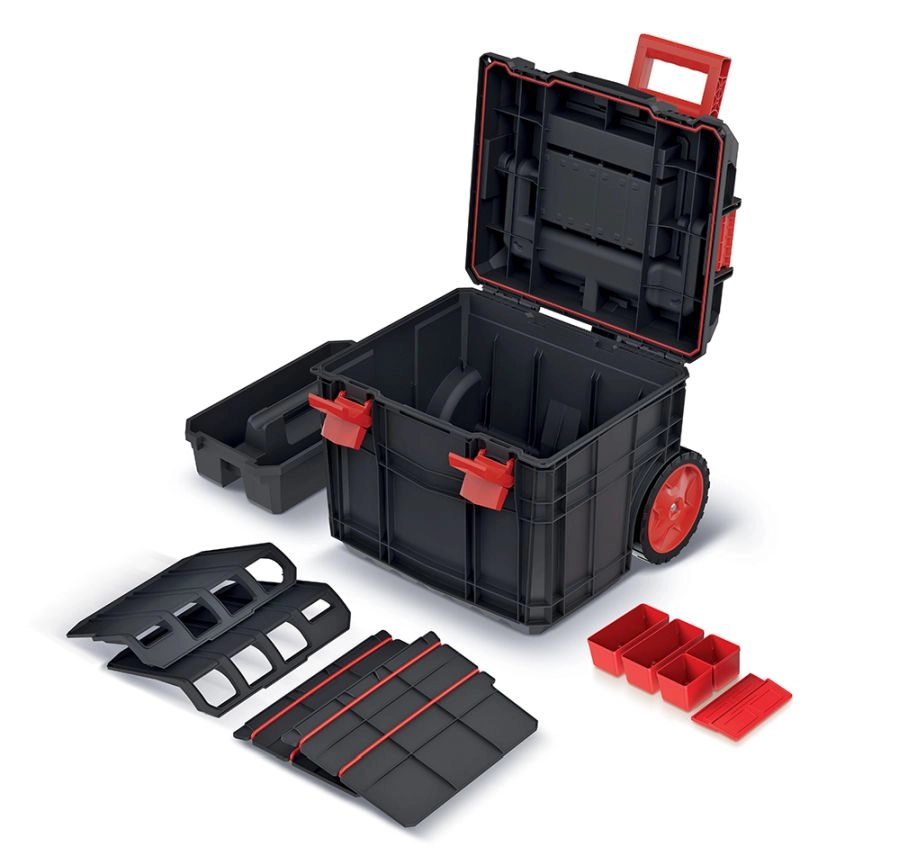 Dwie wyjmowane przegrody, małe pojemniki i uchwyty na narzędzia utrzymują wszystko w przejrzystym porządku. Łatwo dopasujesz przestrzeń do bieżących potrzeb.