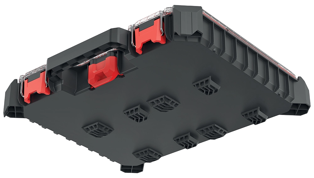 Wnętrze tworzy 10 wyjmowanych pojemników, które można łatwo dopasować do bieżących potrzeb. Przezroczysta pokrywa z poliwęglanu umożliwia kontrolę zawartości na pierwszy rzut oka, a solidne uszczelnienie chroni przed kurzem i wodą. Metalowe zawiasy oraz zamki z ABS z elementami metalowymi zapewniają wysoką trwałość całości.