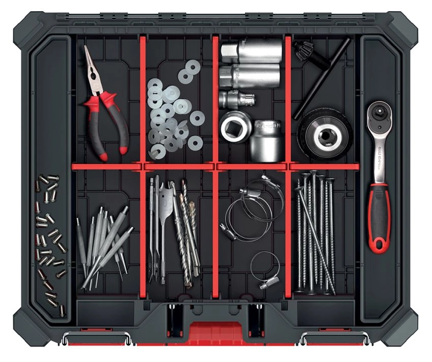 Korpus z wytrzymałej mieszanki polimerów uzupełniony o elementy ABS i metalowe zawiasy wytrzymuje wymagające użytkowanie. Uszczelnienie przeciw kurzowi i wodzie chroni zawartość w zapylonym środowisku warsztatu i na budowie. Dzięki modułowej konstrukcji łatwo zmienisz układ i utrzymasz wszystko na miejscu podczas przenoszenia.