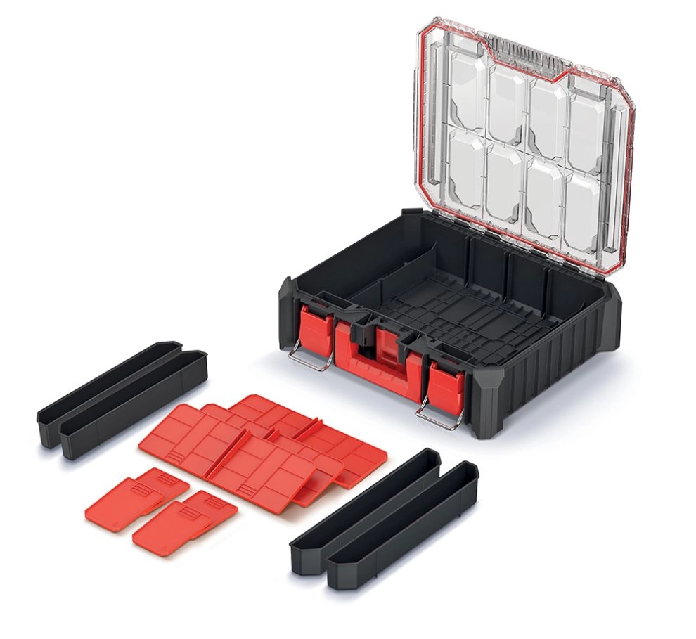 Zachowaj porządek w warsztacie i w trasie dzięki solidnemu organizerowi na narzędzia w czarnym kolorze. Konstrukcja kuferkowa z wyjmowanymi boxami i przegrodami umożliwia szybkie dopasowanie wnętrza do bieżących potrzeb, niezależnie czy przechowujesz wkręty, kołki, bity czy drobne narzędzia. Przezroczysta pokrywa z poliwęglanu zapewnia doskonały podgląd bez konieczności otwierania.