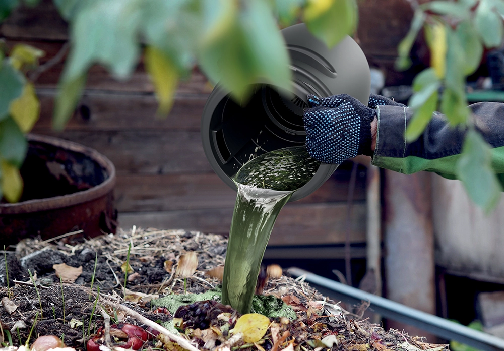 COMBIOLIQ to kompaktowe rozwiązanie do wytwarzania płynnego nawozu z powszechnych roślin ogrodowych i łąkowych. Wystarczy napełnić wewnętrzne sitko porwaną zieleniną, zalać wodą deszczową i pozostawić na 2–4 tygodnie do fermentacji. Regularne mieszanie i odpowiednia temperatura przyspieszają proces, a powstaje ekstrakt pełen składników odżywczych, który wspiera wzrost, kwitnienie i witalność roślin oraz poprawia strukturę gleby.