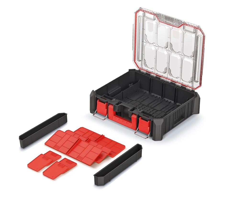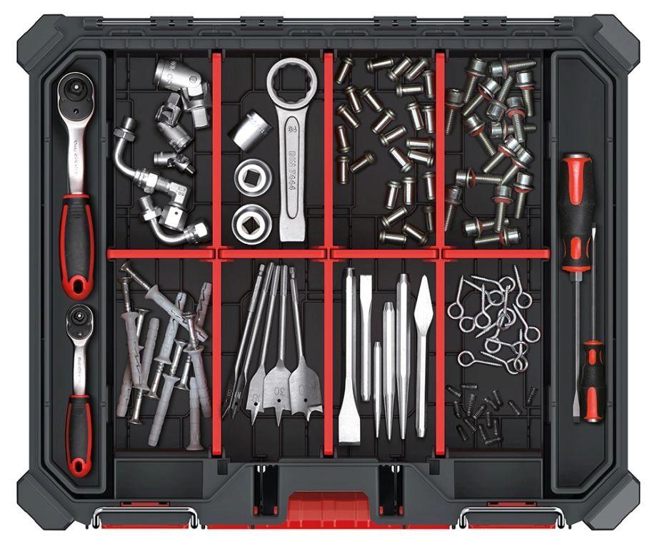 Przemyślany układ wewnętrzny z 2 oddzielnymi pojemnikami i 7 wyjmowanymi przegródkami ułatwia organizację śrub, kołków rozporowych, wierteł i drobnych akcesoriów. Wysokiej jakości uszczelnienie zapobiega przedostawaniu się kurzu i wody, chroniąc przechowywane przedmioty. Metalowe zawiasy i solidne zatrzaski z ABS bezpiecznie utrzymują pokrywę zamkniętą, a ergonomiczny uchwyt zapewnia wygodne przenoszenie.