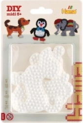 Zestaw podstawek Hama do koralików do prasowania pozwala dzieciom od 5 lat tworzyć kolorowe obrazki dziękibiałym plastikowym podkładkom w kształcie słonia, pingwina oraz pieska.
