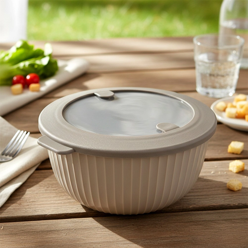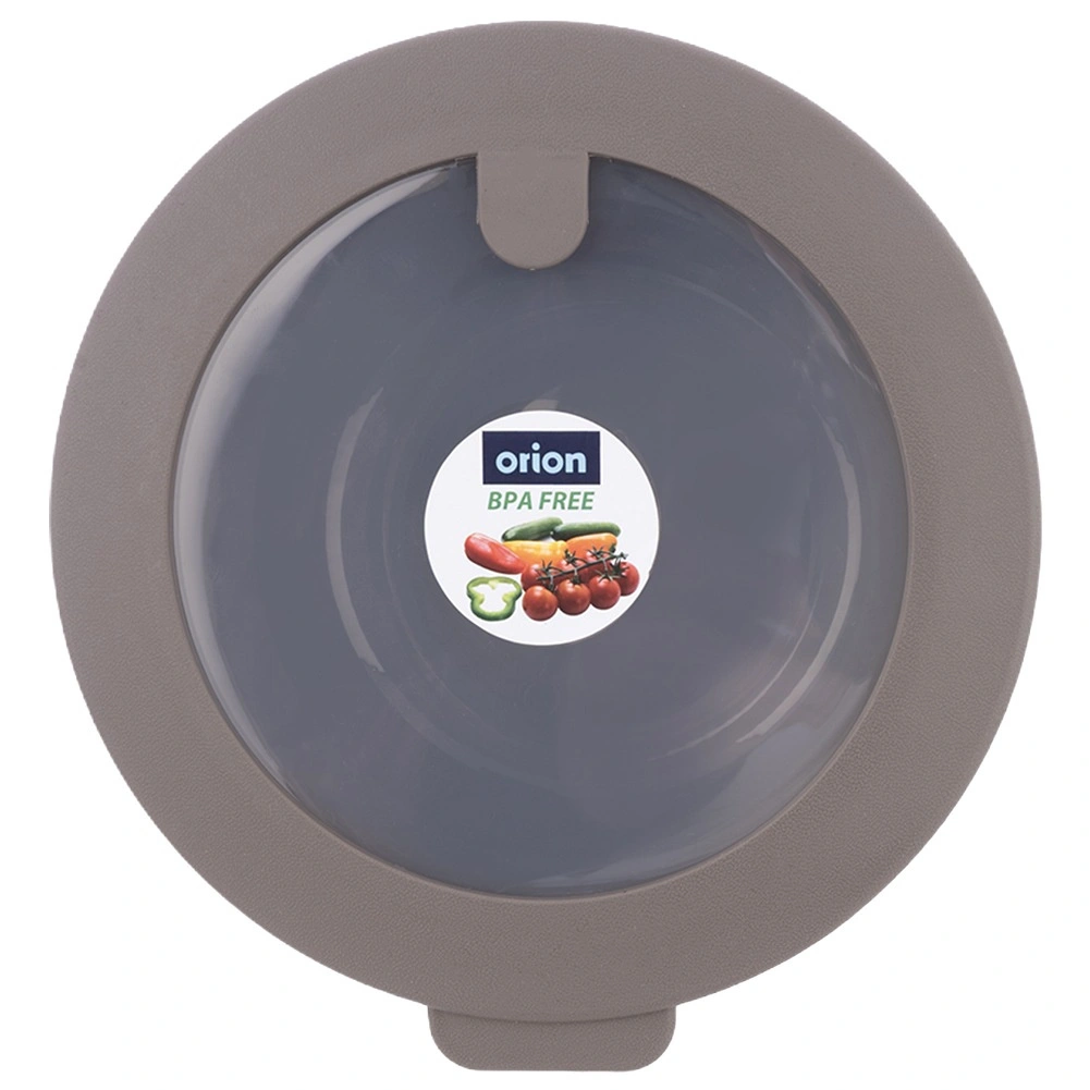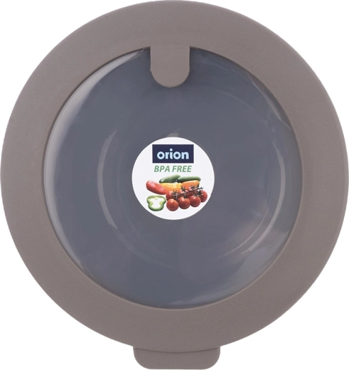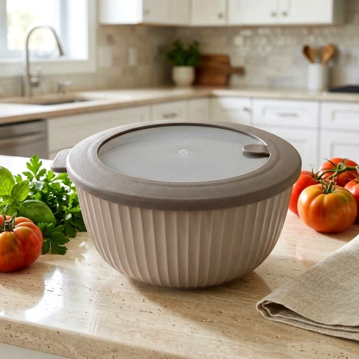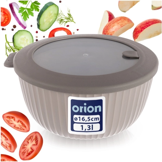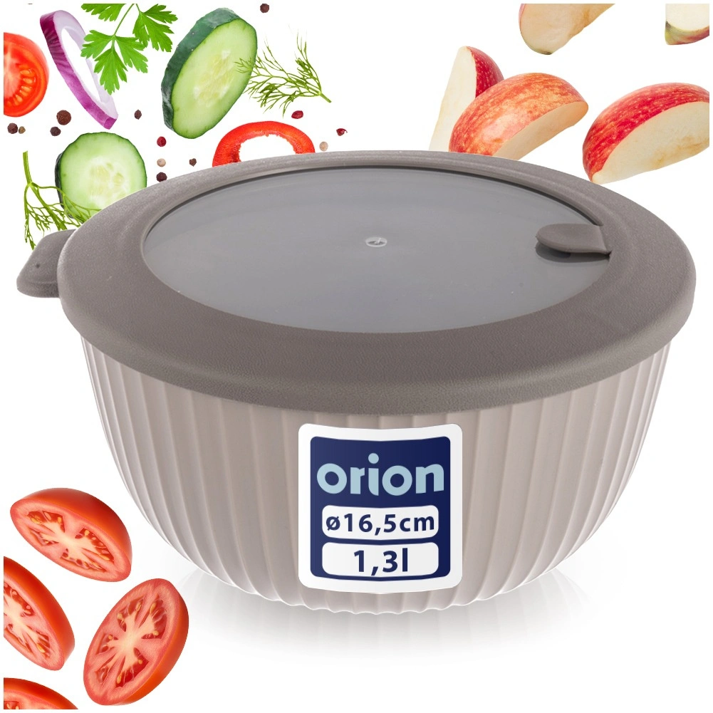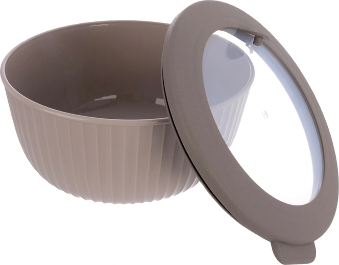 - Beżowa miska, szara/przezroczysta pokrywka
