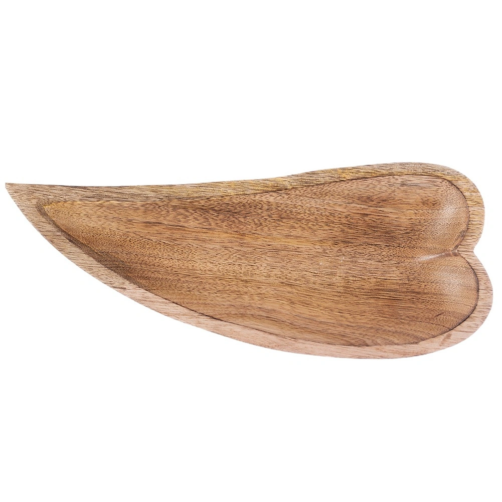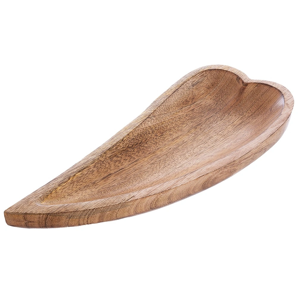 Stylowy talerz do serwowania z naturalnego drewna mango w eleganckim liściowym/sercowatym kształcie doskonale sprawdzi się do podawania przekąsek, deserów i przystawek. Dzięki wymiarom 38 × 15,5 × 3,5 cm jest idealny na orzechy, ciastka czy owoce, a jednocześnie ozdobi każdy stół. Naturalne drewno mango, trwałe wykonanie i niepowtarzalne usłojenie nadadzą Twojemu stołowaniu rustykalnego i nowoczesnego charakteru.