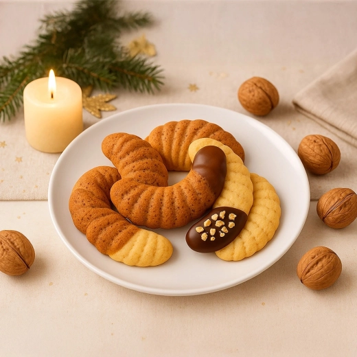 Forma o wymiarach 34,5 × 24,5 × 1,2 cm oferuje 30 zagłębień do równomiernego pieczenia kruchych rogalików o długości ok. 5,5 cm. Idealna do szybkiego przygotowania większych porcji.