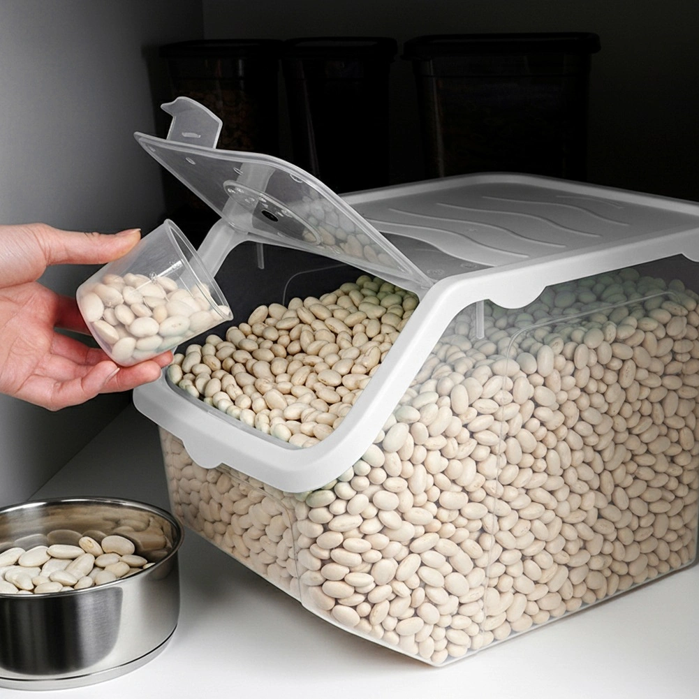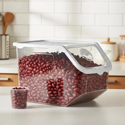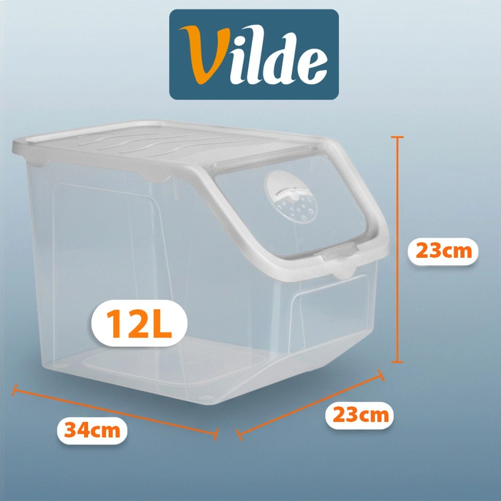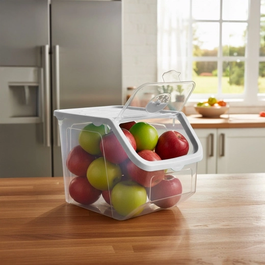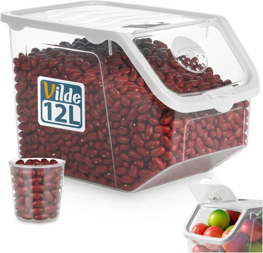 Ten przezroczysty pojemnik o pojemności 12 litrów jest idealny do przejrzystego i czystego przechowywania cebuli, ziemniaków, czosnku, owoców, a także karmy dla zwierząt czy proszków. Otwierana klapka na klik ułatwia codzienne użytkowanie – zawartość można szybko uzupełnić lub pobrać dokładnie tyle, ile potrzeba.