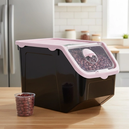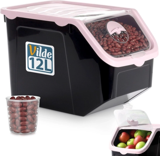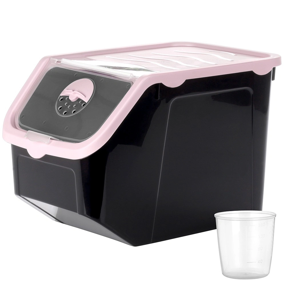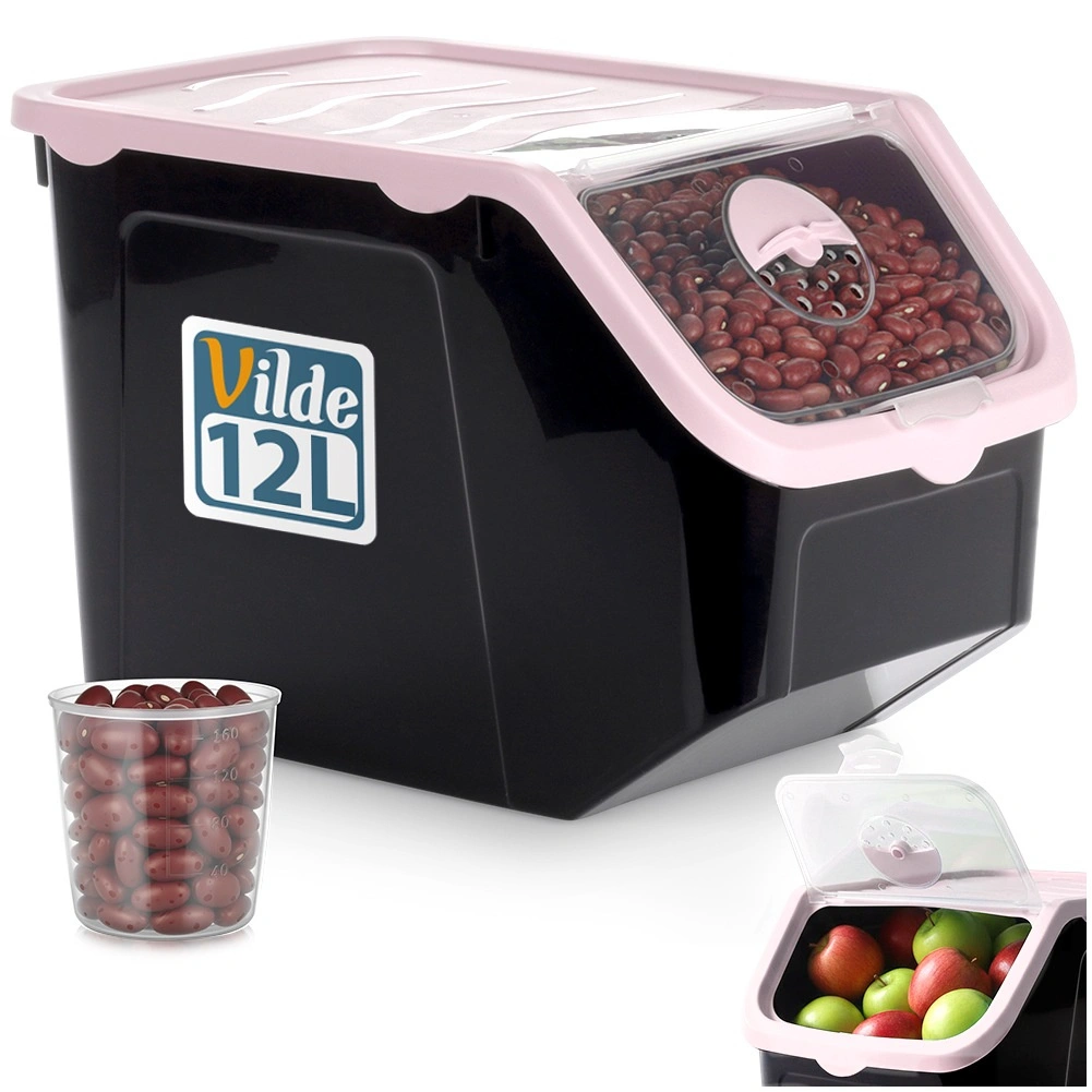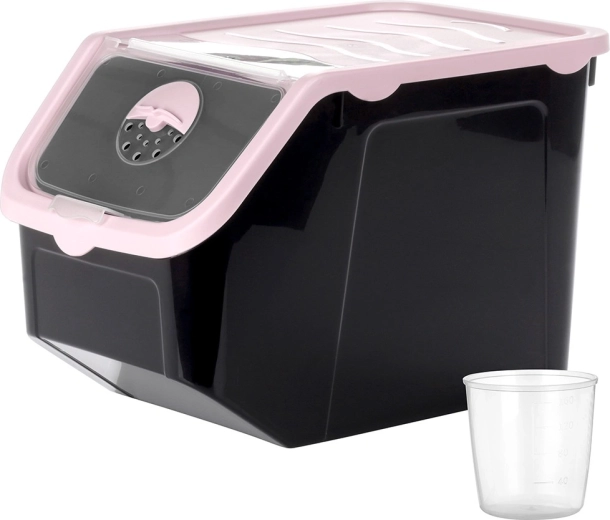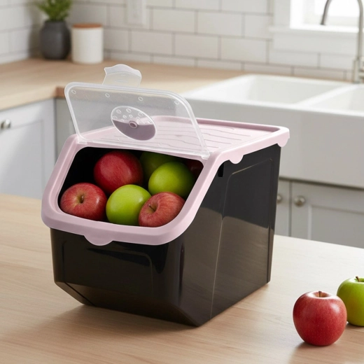 Praktyczny pojemnik z wytrzymałego plastiku w kolorze czarnym z różową pokrywką jest idealny do przechowywania cebuli, ziemniaków, czosnku, owoców oraz sypkich produktów (rośliny strączkowe, karma, proszki). Przezroczysta przednia klapka umożliwia szybki podgląd zawartości i wygodne dozowanie, pokrywkę można uchylić lub całkowicie zdjąć. Materiał jest bezpieczny dla żywności, nie zawiera BPA i wytrzymuje temperatury od -20 °C do 100 °C.