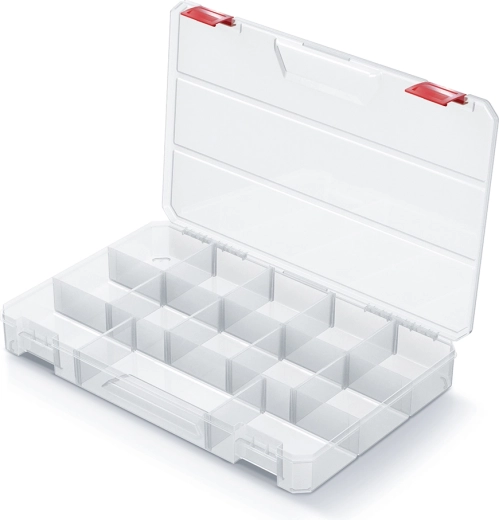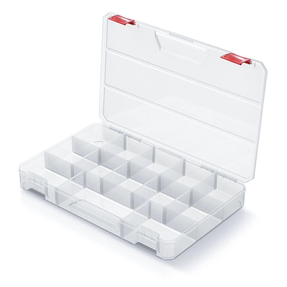 Dzięki 11 przegrodom i 8 wyjmowanym modułom łatwo dopasujesz układ wnętrza do bieżących potrzeb. Lekka, lecz wytrzymała konstrukcja z tworzywa wraz z solidnymi zatrzaskami zapewnia bezpieczne przechowywanie i transport drobnych części.