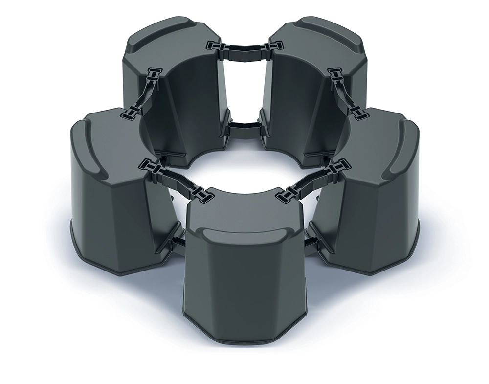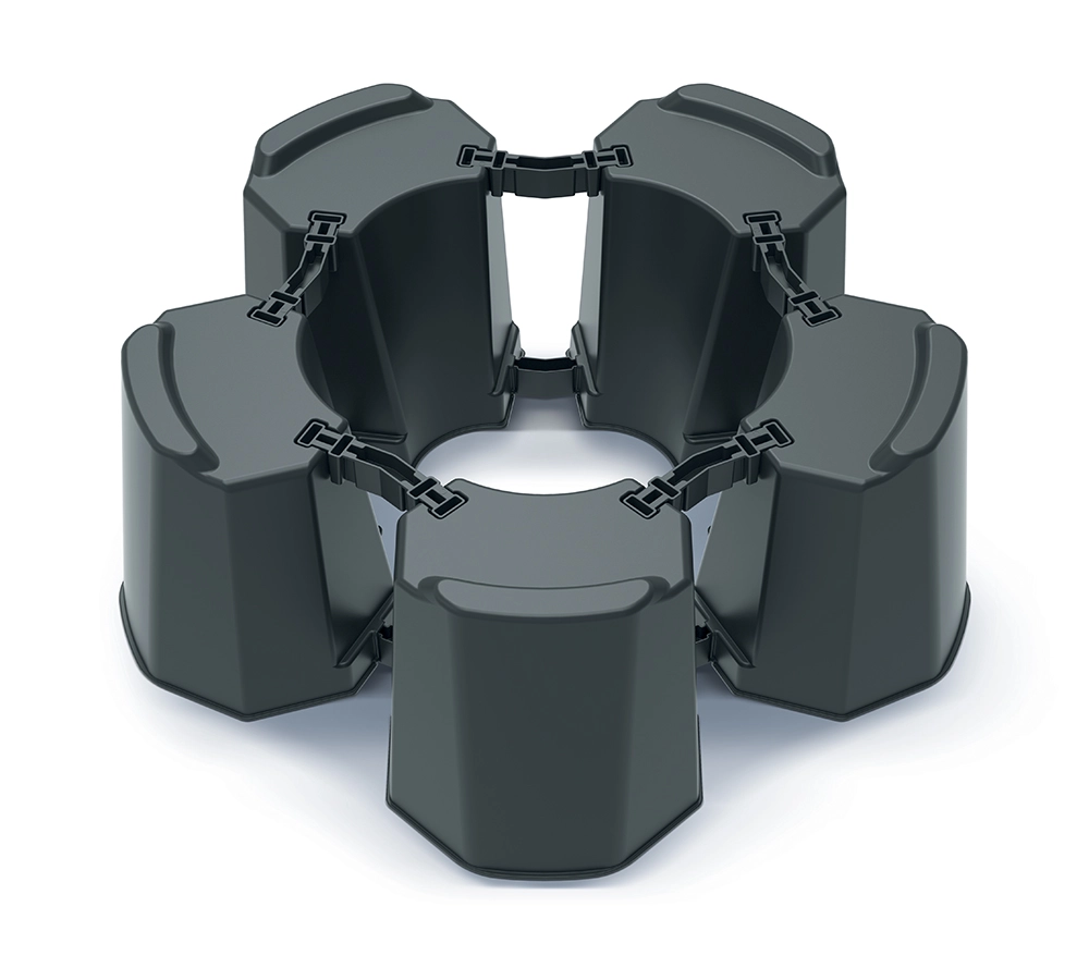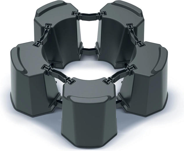 Dzięki sprytnie zaprojektowanym segmentom i łącznikom łatwo dopasujesz średnicę podstawy do rozmiaru beczki. Trwały plastik jest odporny na warunki atmosferyczne i promieniowanie UV, zapewniając długą żywotność bez wymagającej konserwacji.