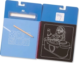 Wystarczy wziąć dołączone drewniane rylce, delikatnie zeskrobać czarną warstwę, a pod nią pojawią się wielobarwne obrazki. Dołączone szablony i naklejki pomogą dzieciom tworzyć własne motywy, rozwijać małą motorykę, kreatywność i cierpliwość.