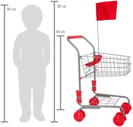 Srebrny dziecięcy wózek sklepowy SMALL FOOT w realistycznym designie wyróżnia się stabilną metalową konstrukcją, czerwonymi akcentami i flagą bezpieczeństwa. Dzięki obracanym przednim kółkom wózkiem łatwo manewrować nawet w mniejszych przestrzeniach, a dzieci mogą wygodnie „robić zakupy” jak rodzice.