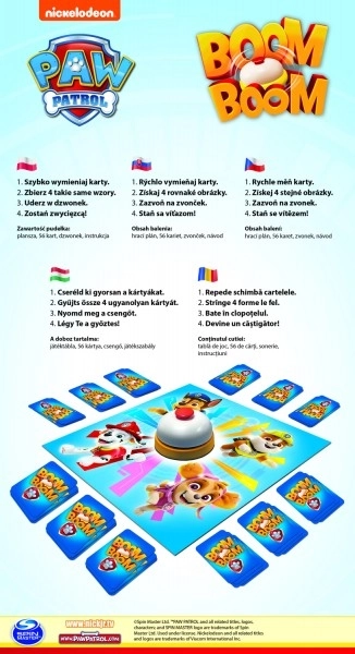 Do nadmorskiej zabawy z grą Boom Boom Psi Patrol potrzebujesz jedynie zmysłów i szybkich reakcji. Gra toczy się jednocześnie dla wszystkich, a celem jest wymienianie kart i jak najszybsze zdobycie czwórki tego samego typu. Kto pierwszy osiągnie cel, naciska dzwonek, aby ogłosić swój sukces!