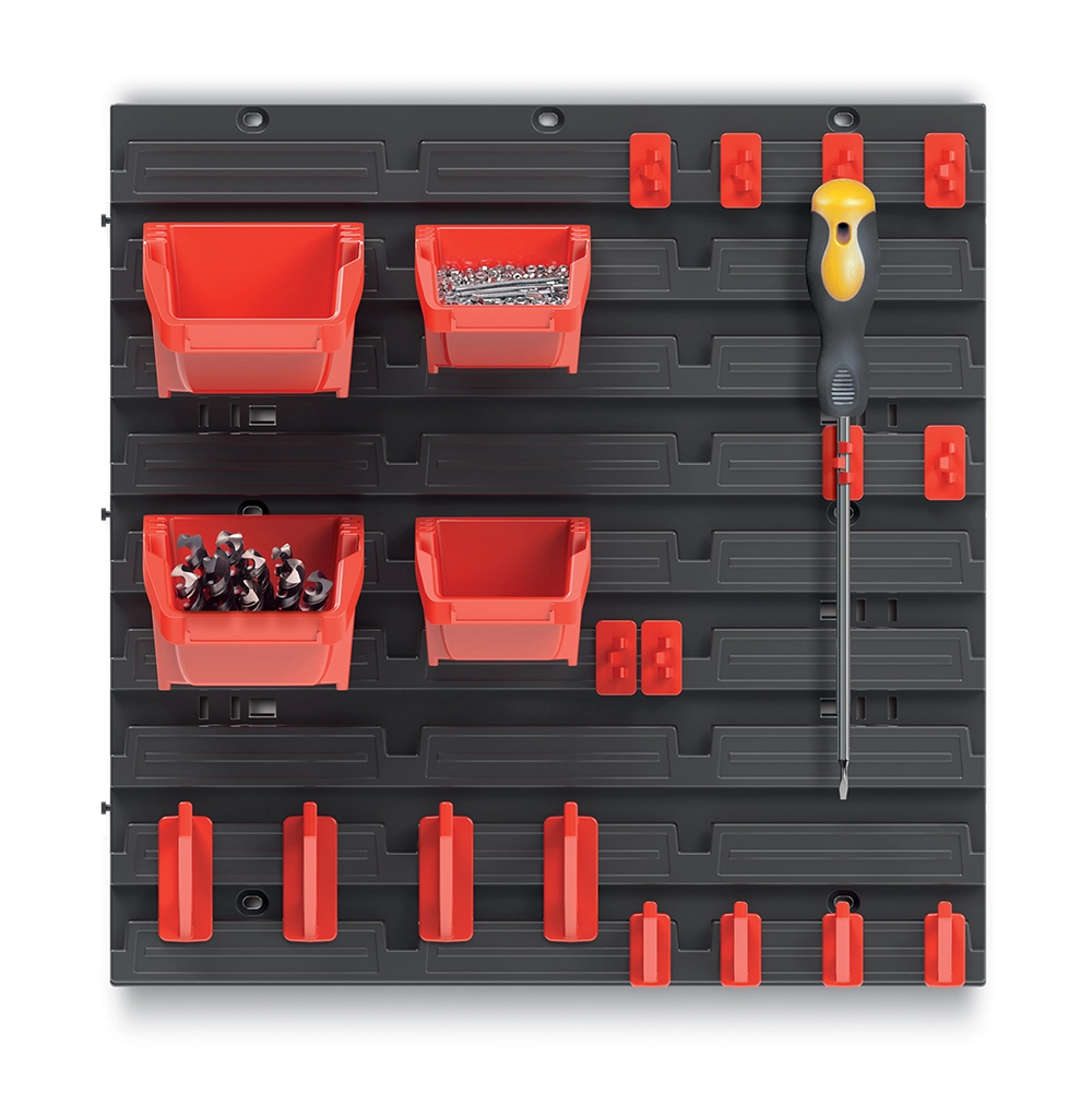 Praktyczny wiszący panel Bineer pomaga utrzymać warsztat, garaż lub pomieszczenie techniczne w idealnym porządku. Oferuje 4 pojemniki do przechowywania, zestaw haczyków na narzędzia oraz kompaktowe wymiary 39,5 × 16,5 × 39,5 cm. Trwały plastik w czarno‑czerwonym kolorze gwarantuje długą żywotność, łatwą pielęgnację i schludny wygląd miejsca pracy.