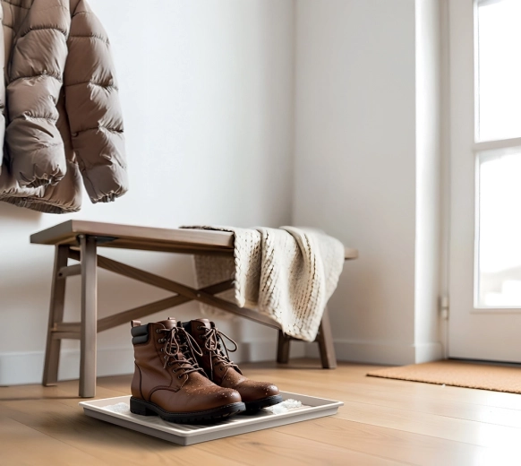 Mata odkładcza Tassy Dry Pad to sprytne rozwiązanie, które pomaga utrzymać porządek w przedpokoju, łazience, garażu i na balkonie. Recyklingowany plastik gwarantuje długą żywotność, odporność na wilgoć oraz łatwą pielęgnację — wystarczy przetrzeć lub opłukać.
