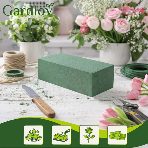 Twórz stabilne kwiatowe dekoracje, które pozostaną piękne na dłużej. Mokra gąbka florystyczna GARDLOV po prawidłowym nasączeniu wodą stopniowo nawadnia świeże kwiaty i jednocześnie stabilizuje łodygi pod dokładnie wybranym kątem. Wymiary 23 × 11 × 8 cm pasują do standardowych naczyń i można je łatwo dopasować nożem.