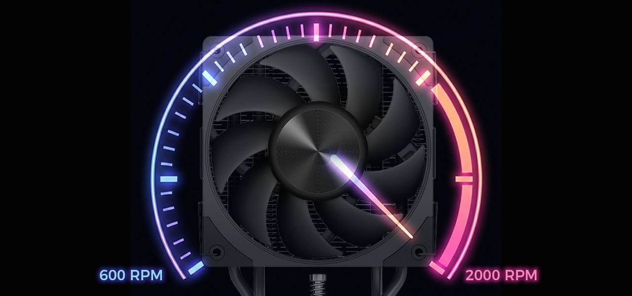 Wentylator 120 mm z regulacją PWM pracuje w szerokim zakresie obrotów 600–2000 obr./min, więc łatwo ustawisz idealną równowagę między chłodzeniem a głośnością. Dzięki przepływowi 75 CFM radzi sobie nawet z dużym obciążeniem, utrzymując niski poziom hałasu około 28 dBA – idealnie do nocnego grania lub pracy.