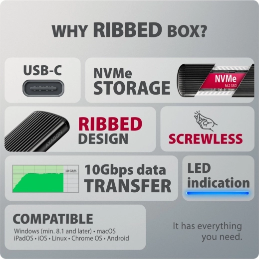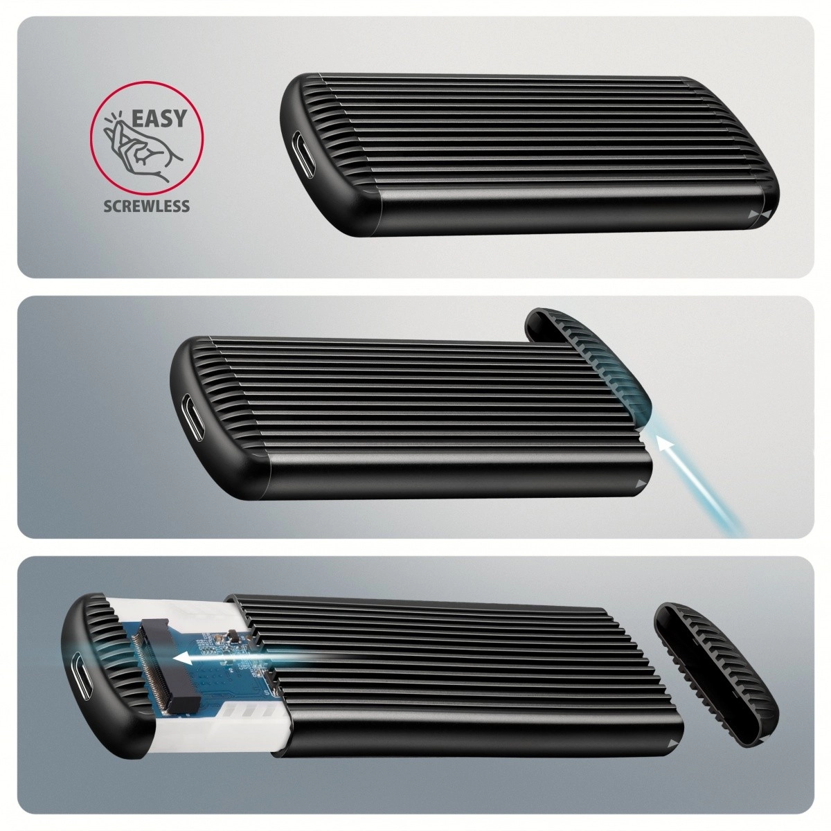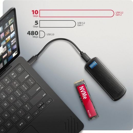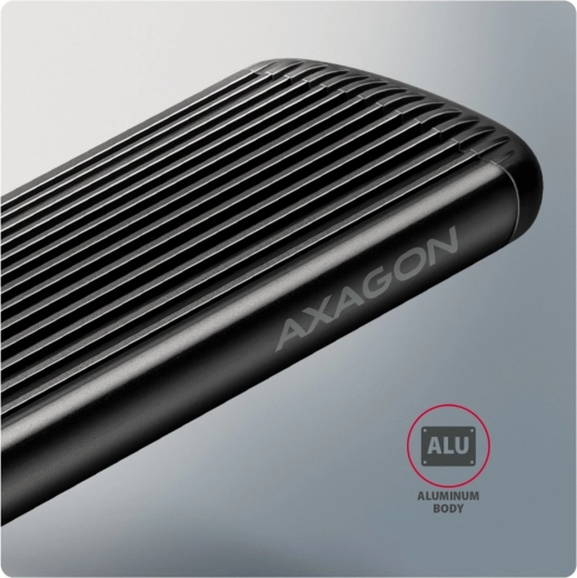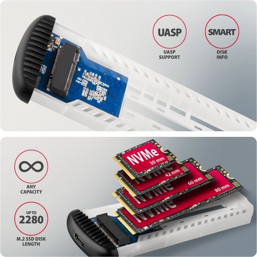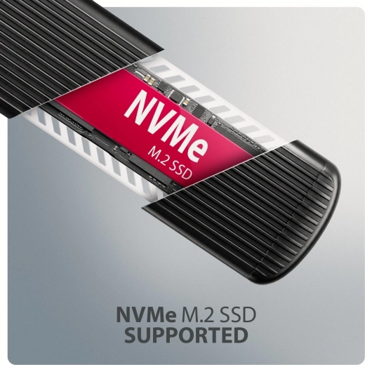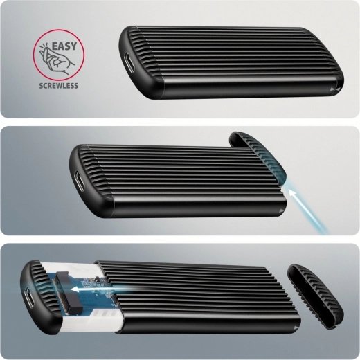 Konstrukcja bezśrubowa znacząco przyspiesza instalację i wymianę SSD przy klonowaniu, migracji danych lub rozszerzaniu pojemności. Żebrowane aluminiowe korpus z termoprzewodzącą podkładką skutecznie odprowadza ciepło, zapobiega thermal throttlingowi i utrzymuje stabilną wydajność. Obudowa bez ograniczeń pojemności obsługuje jednostronne i dwustronne moduły NVMe o długościach 30–80 mm.