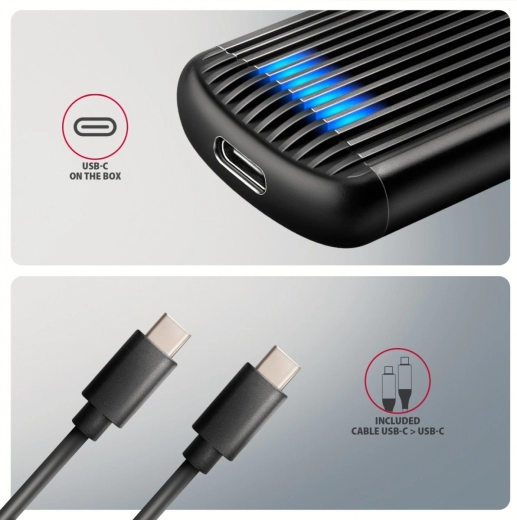 Kompaktowa aluminiowa obudowa AXAGON EEM2-SC zamieni Twoje M.2 NVMe SSD w szybkie zewnętrzne urządzenie pamięci z portem USB‑C 3.2 Gen 2 (10 Gb/s). Oferuje montaż bezśrubowy, wsparcie UASP/TRIM/S.M.A.R.T., świetne chłodzenie dzięki żebrowanej obudowie oraz kompatybilność z długościami SSD 2230/2242/2260/2280. W zestawie znajduje się kabel USB‑C ↔ USB‑C.