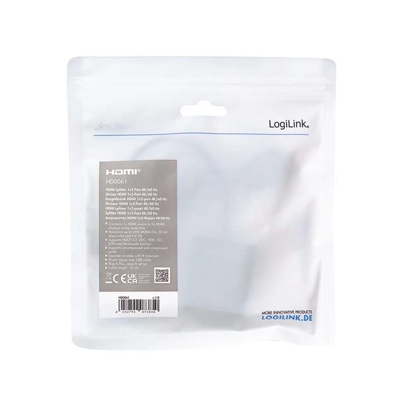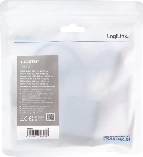 Rozdzielacz HDMI marki LogiLink rozdziela sygnał z jednego źródła na dwa wyświetlacze w jakości 4K UHD przy 60 Hz. Koniec z ciągłym przepinaniem kabli – idealny do prezentacji, showroomów, sklepów, restauracji oraz kina domowego. Dzięki obsłudze interfejsu IR możesz sterować splitterem i telewizorem pilotem (opcjonalnie).