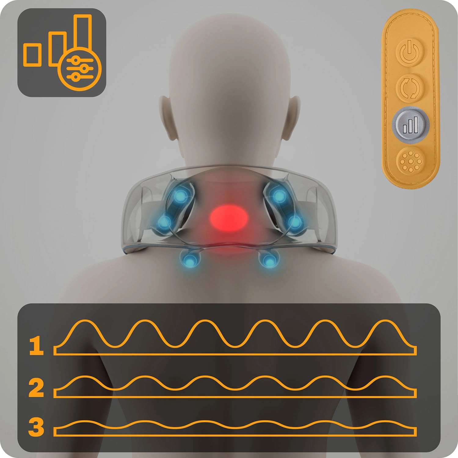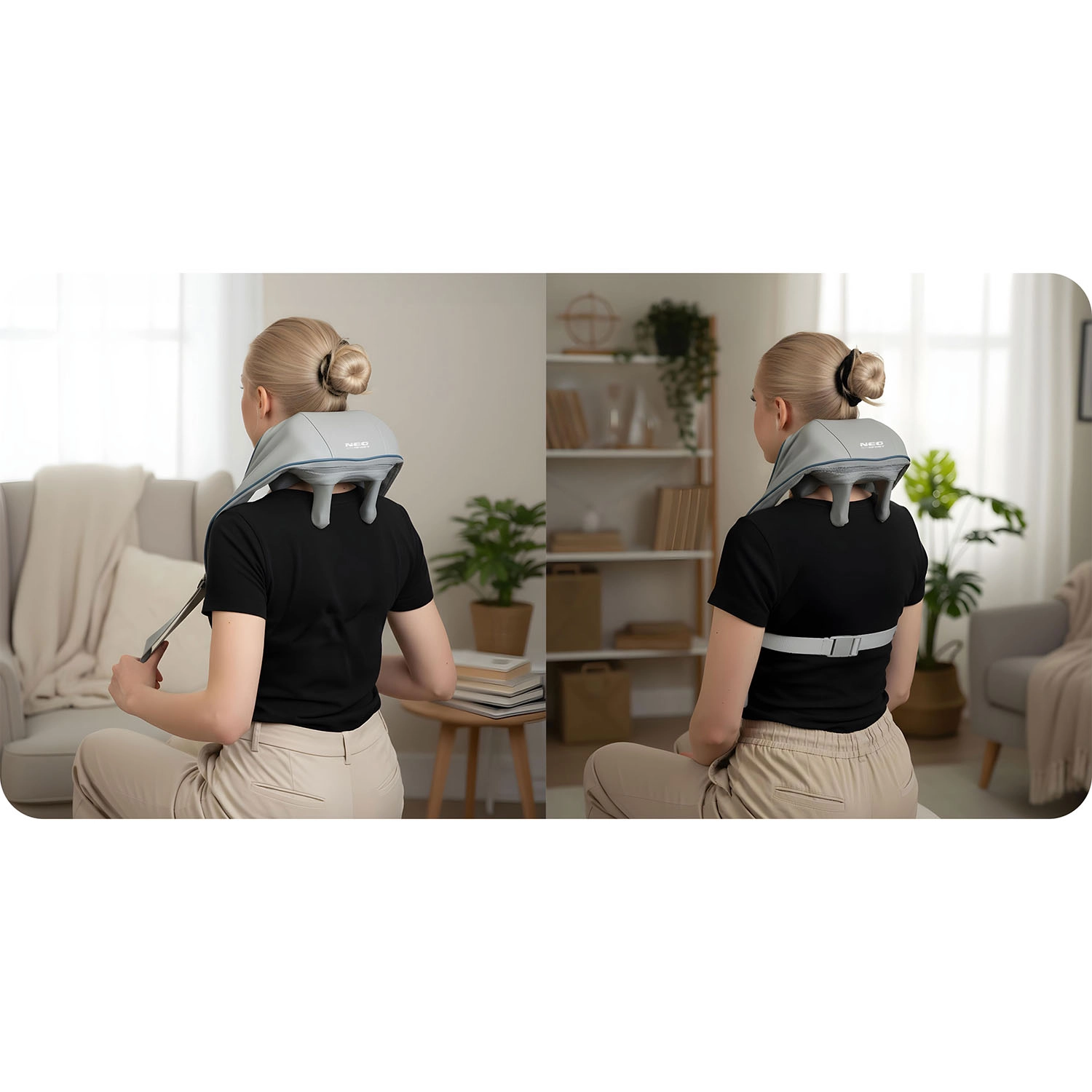 Intuicyjny panel pozwala jednym dotknięciem przełączać 3 poziomy intensywności, kierunek obrotu i podgrzewanie. Dzięki regulowanym paskom łatwo dopasujesz nacisk – możesz dociągnąć ręcznie lub skorzystać z tylnego paska do użytku bez użycia rąk. Urządzenie idealnie sprawdza się na kark i szyję, ramiona, plecy i lędźwie, a także na uda i łydki po sporcie lub długim siedzeniu.