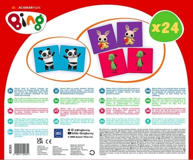 Maxi memo BING to klasyczna gra pamięciowa w przyjaznym wydaniu dla małych dzieci. Dzięki dużym, kolorowym kartom z motywami króliczka BING i jego przyjaciół maluchy uczą się rozpoznawania par, trenują koncentrację i małą motorykę.