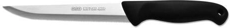 Praktyczny nóż kuchenny z ząbkowanym ostrzem o długości 155 mm do łatwego krojenia pieczywa, warzyw i mięsa. Wykonany z wysokiej jakości stali nierdzewnej, z trwałą i higieniczną rękojeścią z tworzywa. Lekki (61 g), wyważony i odpowiedni do użytku domowego i profesjonalnego. Można myć w zmywarce.