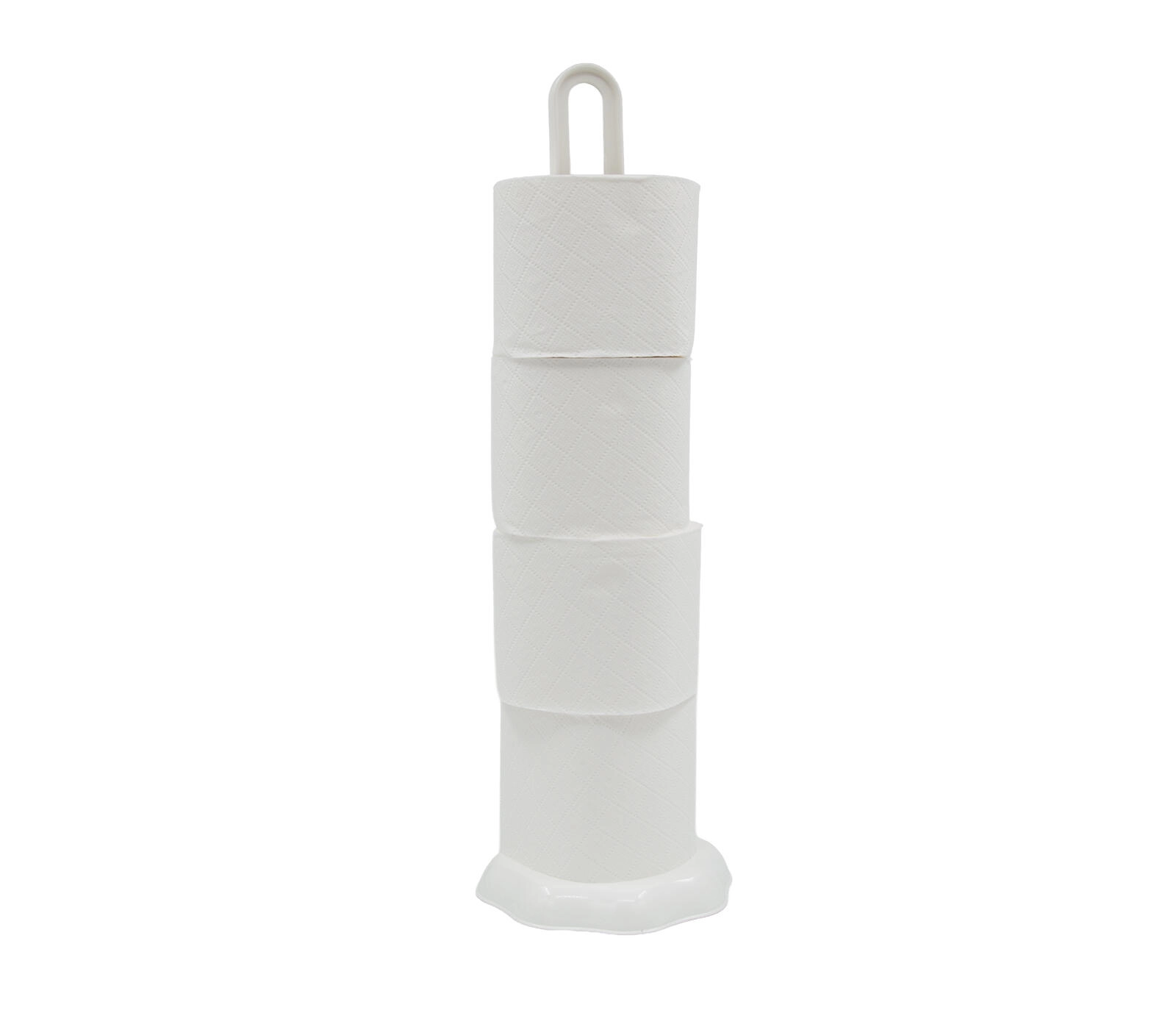 Praktyczny stojak na papier toaletowy o wysokości 47 cm z wytrzymałego plastiku w białym kolorze. Służy jako uchwyt i zasobnik w jednym, dzięki czemu utrzymasz swoją łazienkę w porządku. Stabilna podstawa i oszczędne pionowe przechowywanie sprawiają, że rolki masz zawsze pod ręką.
