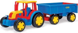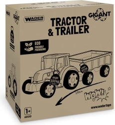 Nasz duży traktor z linii Gigant jest wyposażony w przyczepę z otwieraną tylną burtą. Te pojazdy są idealną zabawką dla dzieci, czy to do budowania, załadunku, czy przenoszenia materiałów. Ruchoma łyżka traktora może działać jak spychacz lub ładowarka, co zwiększa frajdę z zabawy. Atutem tego traktora jest wysokiej jakości wykonanie, trwałość i wytrzymała konstrukcja – traktor wytrzymuje do 100 kg, a przyczepa do 60 kg.