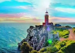 Stwórz piękną scenę z latarnią na greckim wybrzeżu dzięki tym puzzlom. Po ułożeniu obraz ma wymiary 68x48 cm. Dzięki papierowi kalandrowanemu puzzle cechują się wysoką jakością, a bezpieczeństwo podczas układania zapewniają ekologiczne farby.