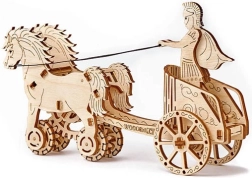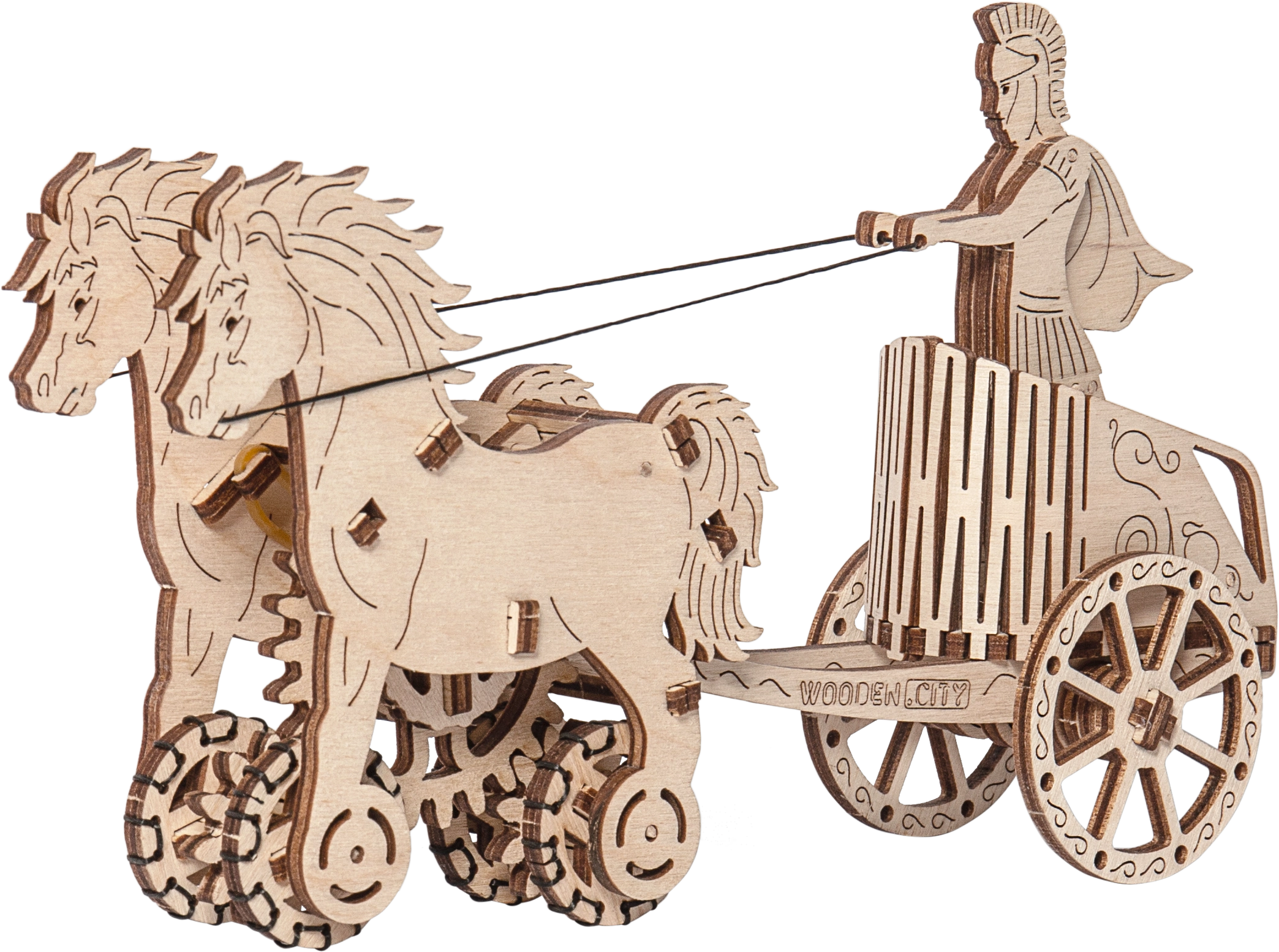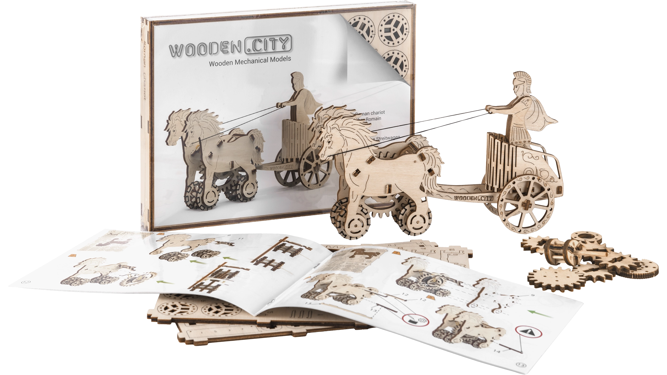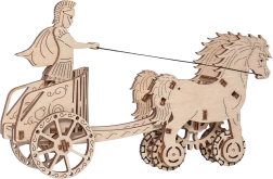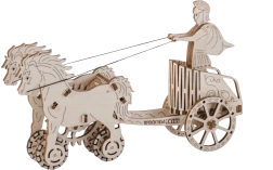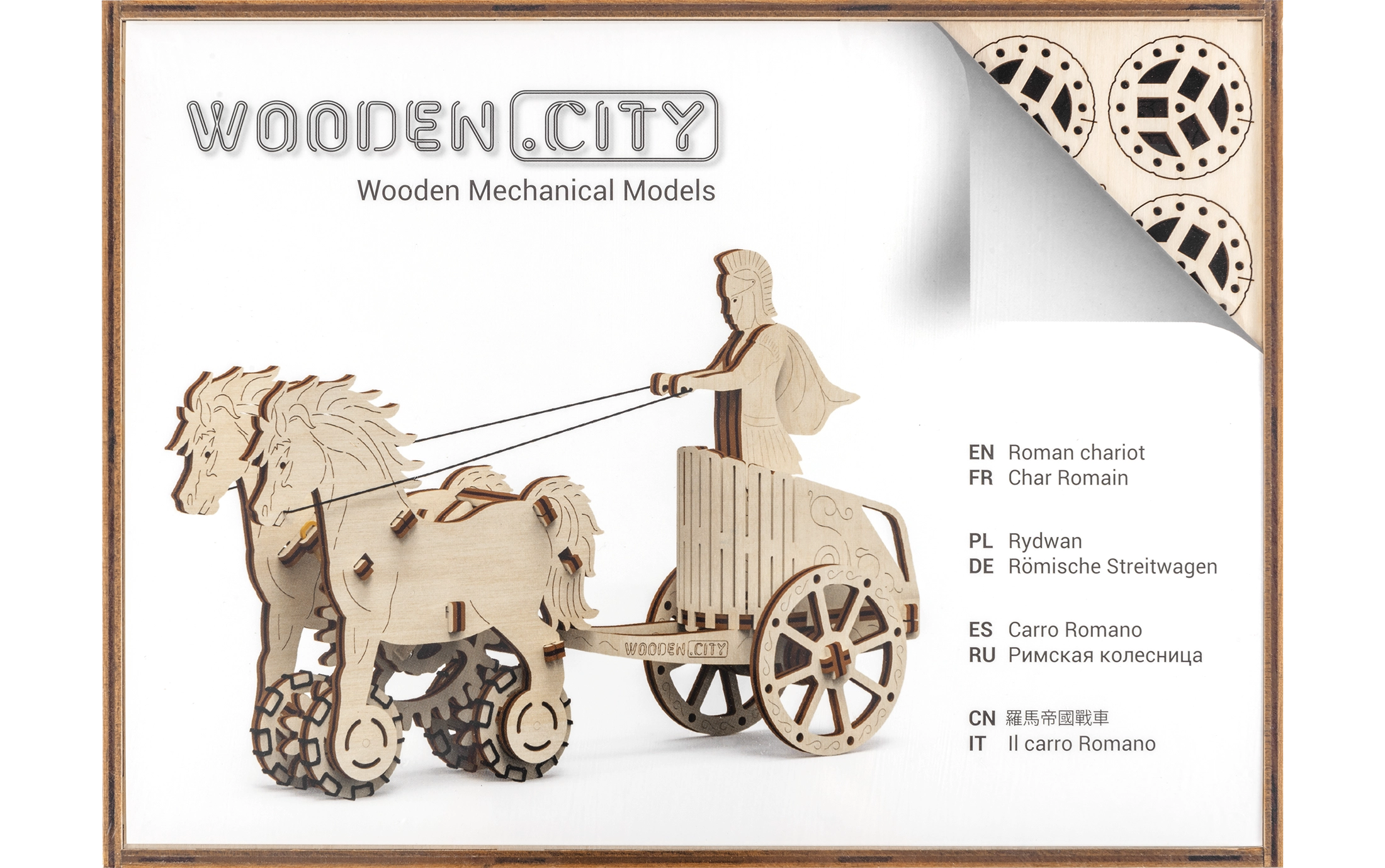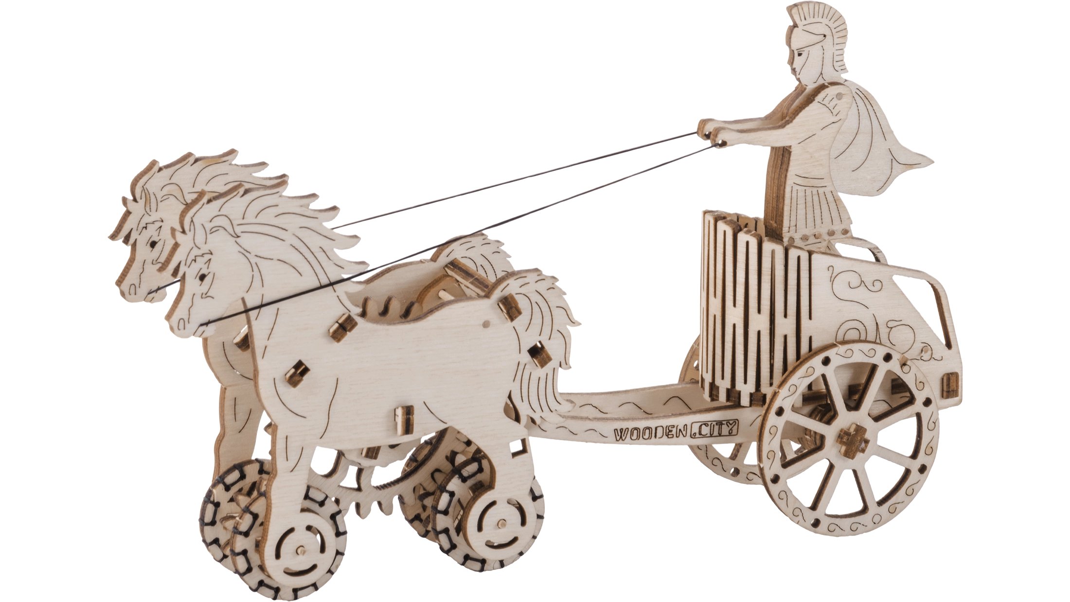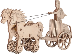 W imię imperium. Zestaw modelu rzymskiego wozu z zaprzęgiem parokonnym, wykonany ze sklejki. W wiernie odwzorowanym wozie znajduje się szczegółowa figura rzymskiego jeźdźca. Dzięki mechanizmowi naprężającemu model potrafi jechać, przy starcie potrafi zaprezentować wspięcie zaprzęgu i pokonuje do 1 metra. Urządzaj wyścigi z innymi modelami Wooden City! Wyposażony w szczegółową instrukcję montażu. Główne cechy: 74 precyzyjnie wycięte elementy, niski poziom trudności montażu, gotowy model jest zdolny do samodzielnej jazdy