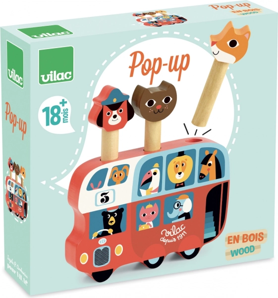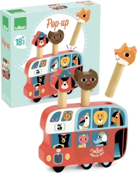 Vilac Drewniana gra wyrzutnia Autobus ze zwierzątkami jest piękną zabawką z ilustracjami znanej artystki Ingeli P. Arrhenius. Trzy urocze postacie – lisek, piesek i kotek – wyskakują z autobusu, co na pewno zapewni dzieciom rozrywkę.